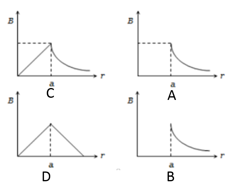 سلك موصل نصف قطرة \[a\] ويمر به تيار ثابت فإن الشكل الصحيح المعبر عن المجال المغناطيسي من مركز السلك إلى خارج السلك و الناتج عن مرور التيار في السلك هو