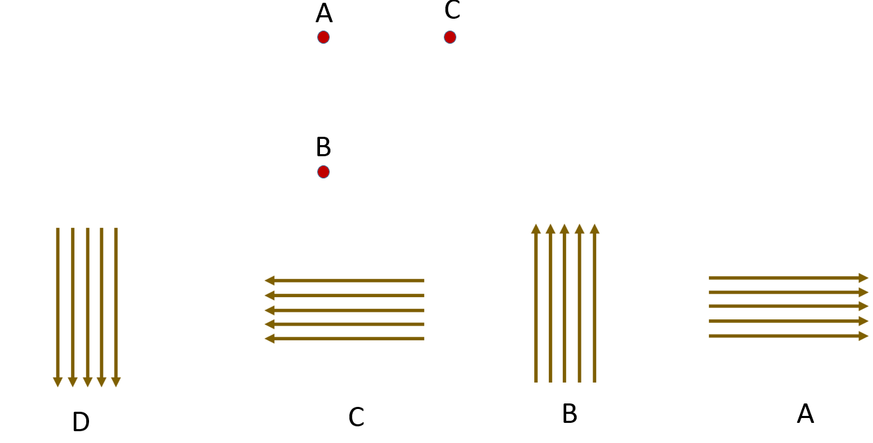 :نضع شحنة أختبار عند النقطة المطلوب تحديد الاتجاه عندها وحسب قواعد المتجهات حاصل ضرب عدد في متجه